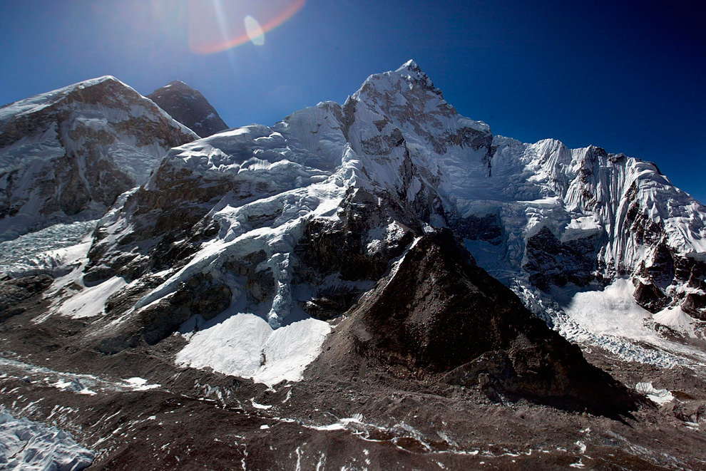 Буддийские молитвенные флаги трепещут на сильном ветре, который дует в сторону снежных пиков горы Эверест в центре и Лхоцзе справа, возле деревни Тенгбоче, Непал 14 мая 2003 год. В этот день сборная команда альпинистов из 12 человек покорила вершину Лхоцзе, установив рекорд за самое большое количество альпинистов поднявшихся на пик за один день